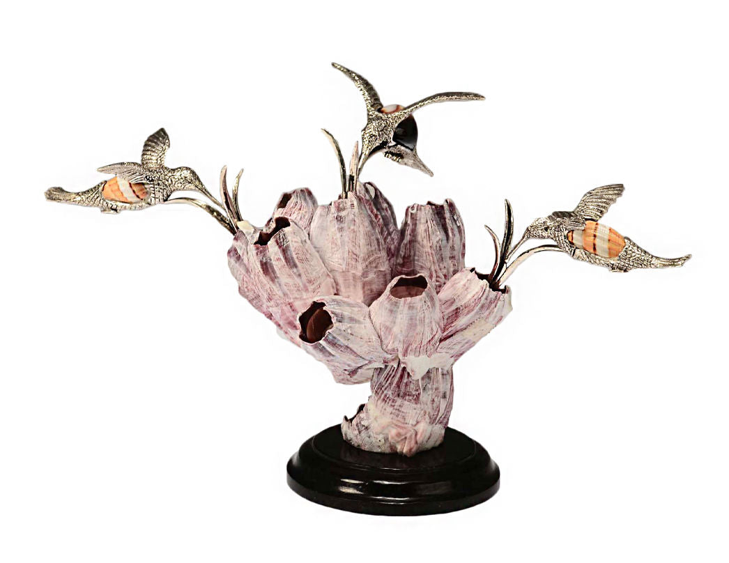 إكسسوار طيور طنانة مطلية بالفضة على قشرة بارناكل