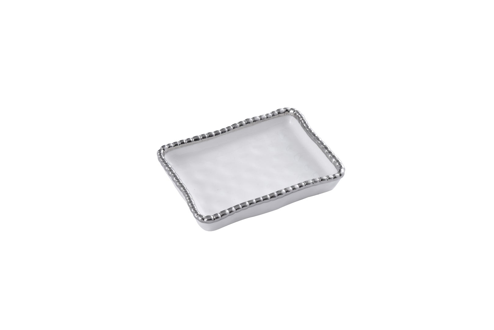 Soap Dish in Vanity Accessories with Silver Beads. This dish is perfect for displaying your soap while keeping your vanity clean and organized. High- fired porcelain with silver titanium beading. Bring the elegance of Pampa Bay into every room of your house.