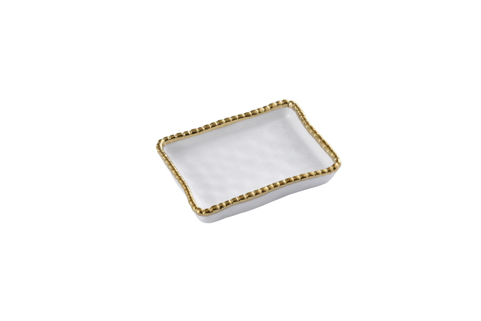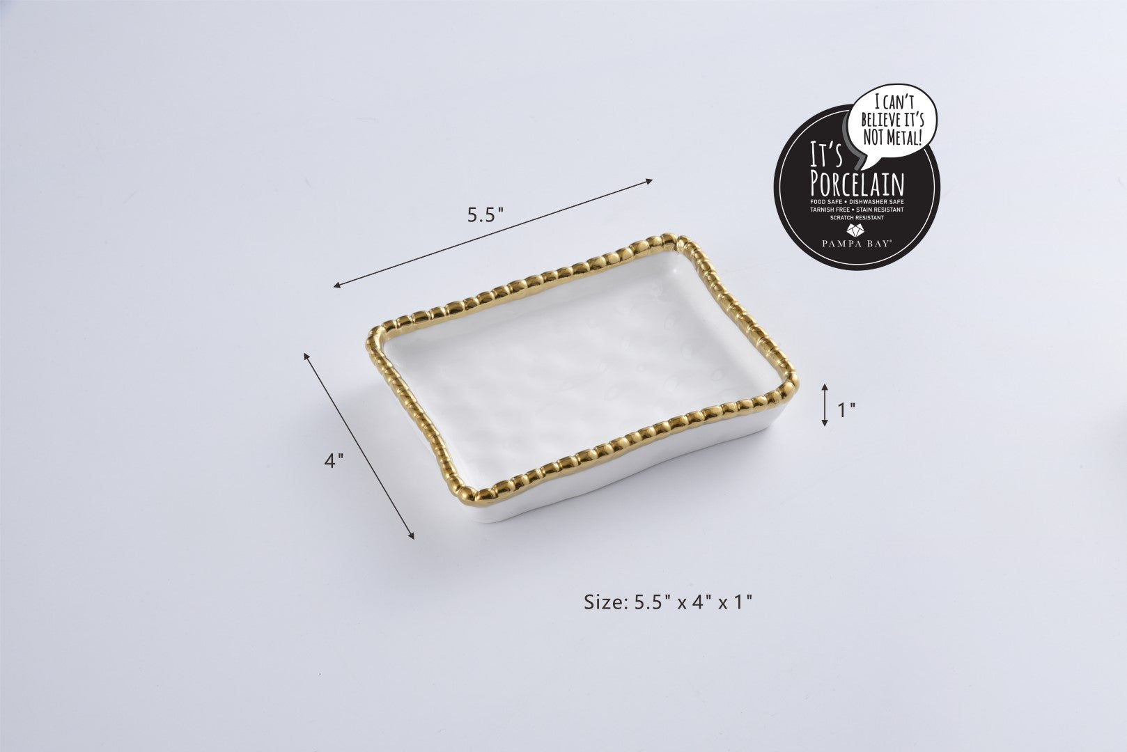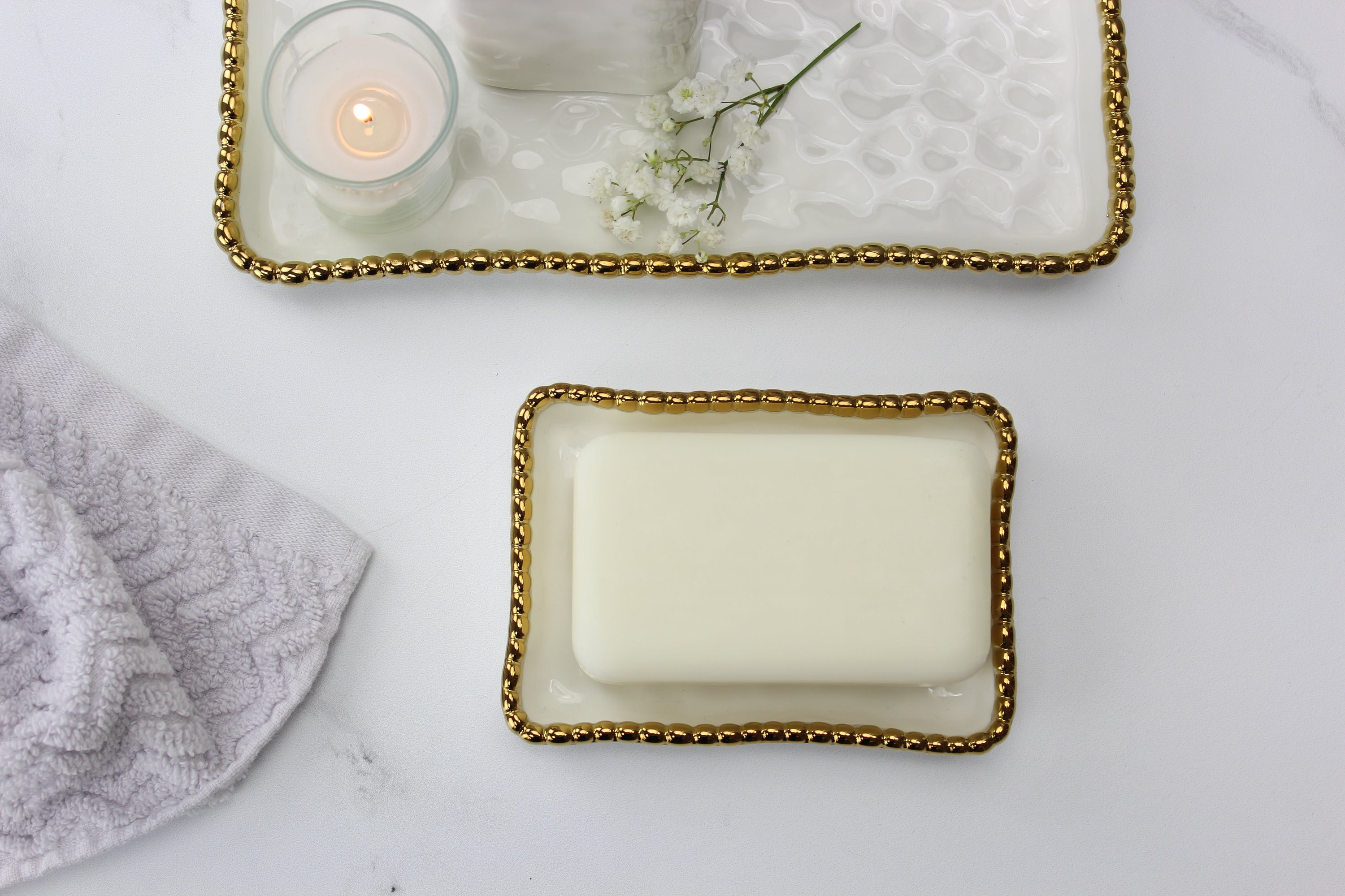 Soap Dish in Vanity Accessories with Gold Beads. This dish is perfect for displaying your soap while keeping your vanity clean and organized. High- fired porcelain with gold titanium beading. Bring the elegance of Pampa Bay into every room of your house.
