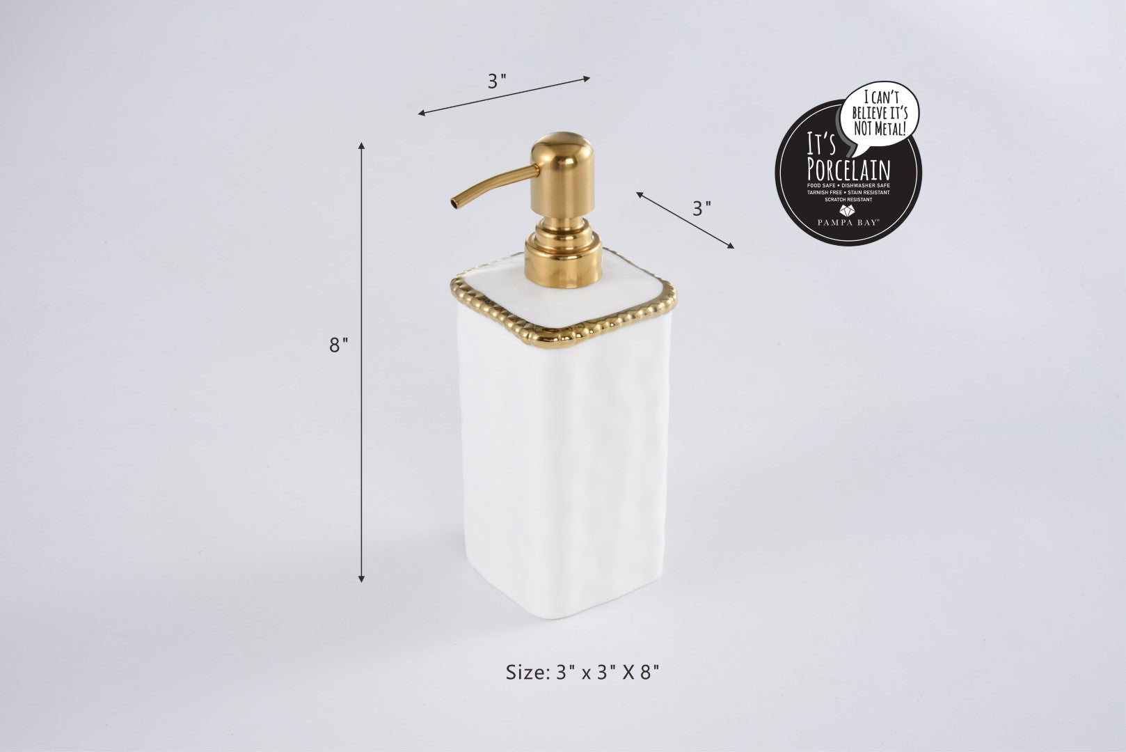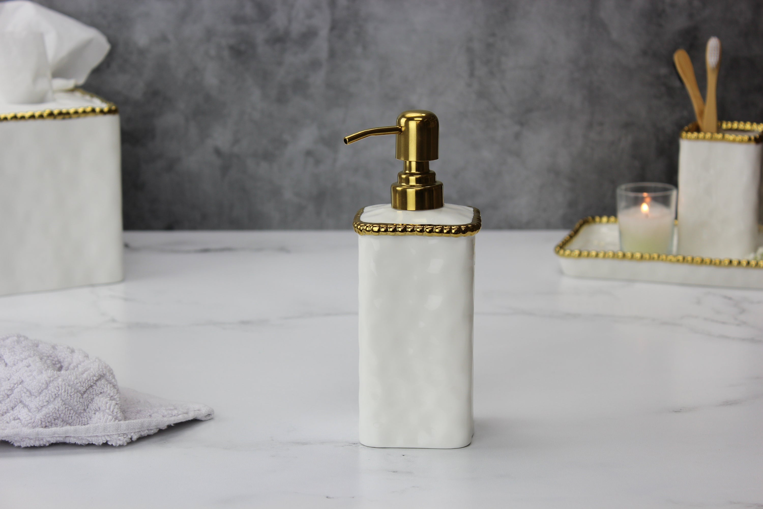 Soap pump in Vanity Accessories with Gold Beads. Elevate the look of your vanity with this elegant soap dispenser. High- fired porcelain with gold titanium beading. Both practical and charming, bring the elegance of Pampa Bay into every room of your house.