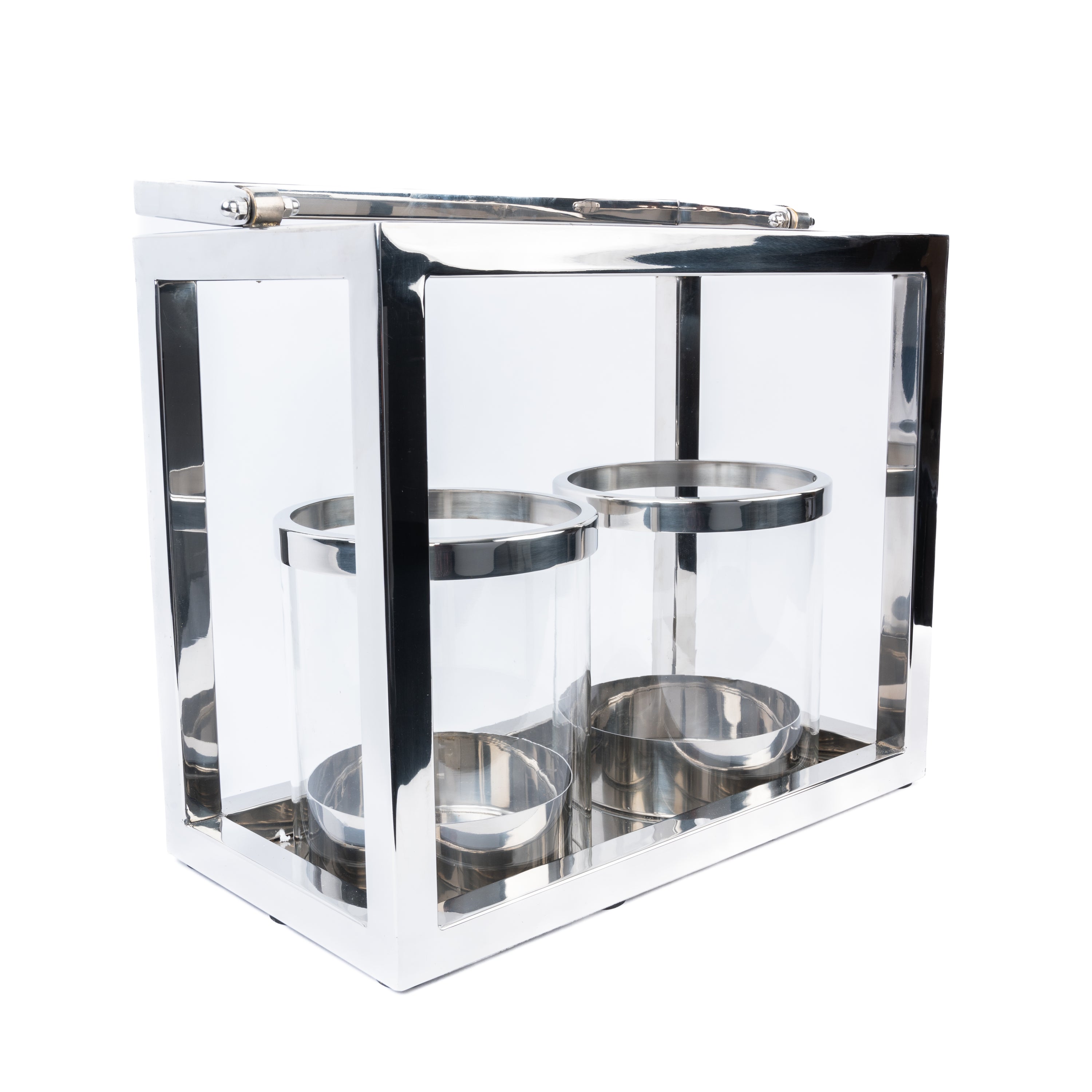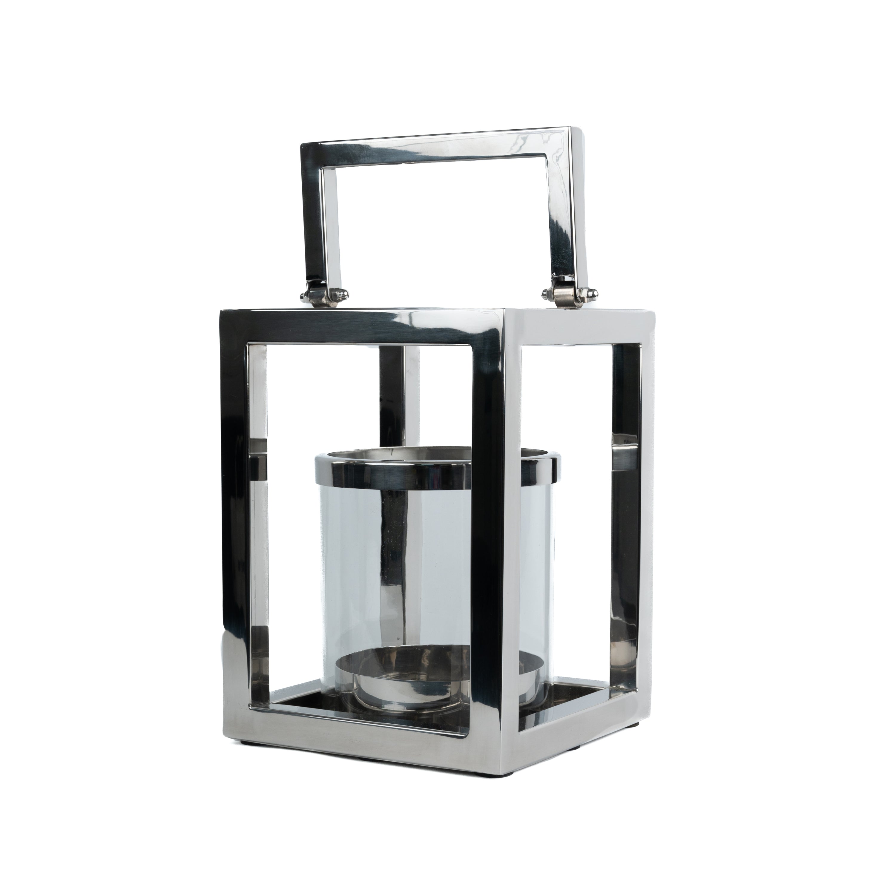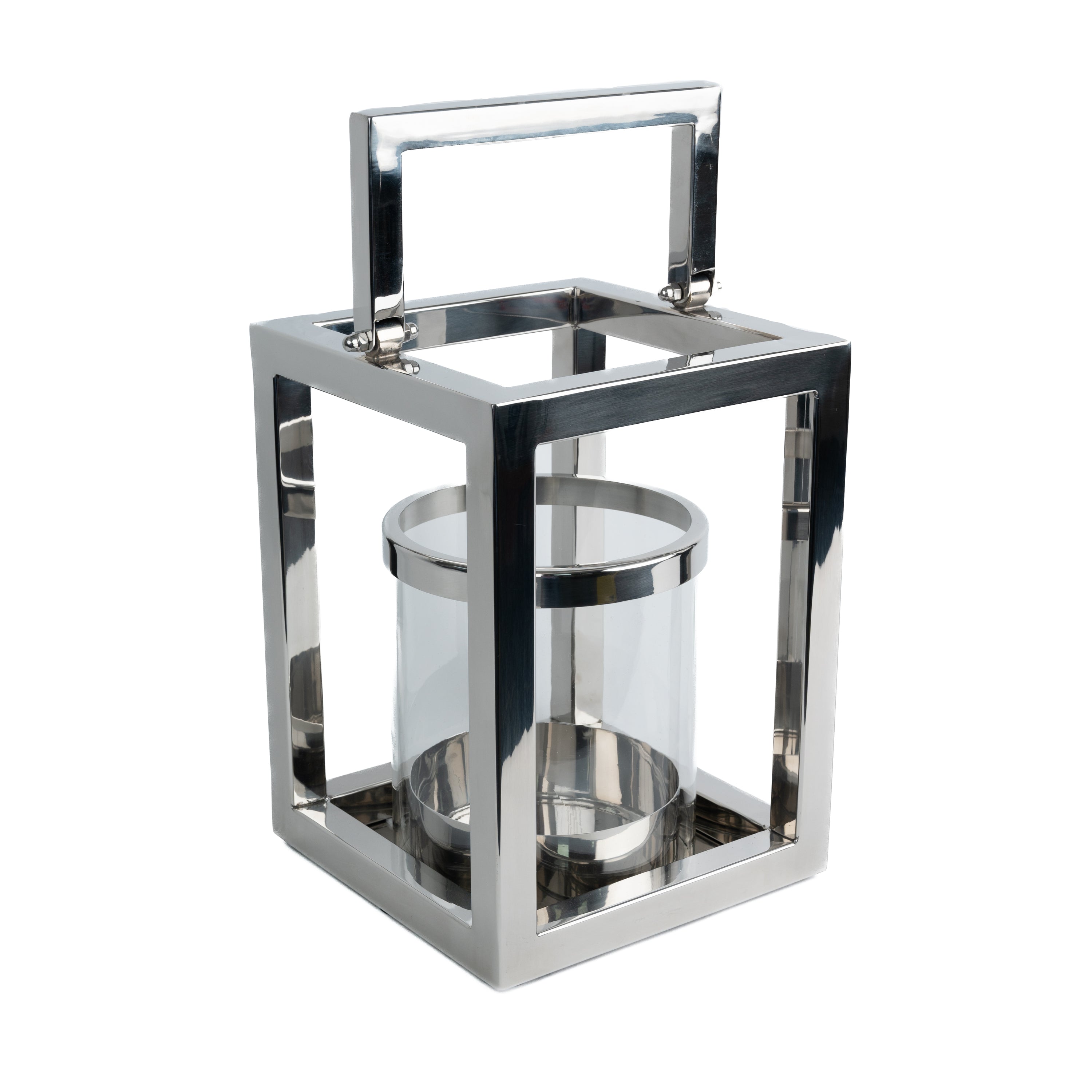 فانوس مميز بتصميم أنيق. تصميم زجاجي داخل حامل فولاذي مستطيل. مع مقبض للنقل، يمكن استخدامه في الخارج أو الداخل، كطاولة أو على الرف. متوفر بثلاثة أحجام: صغير، متوسط وكبير.