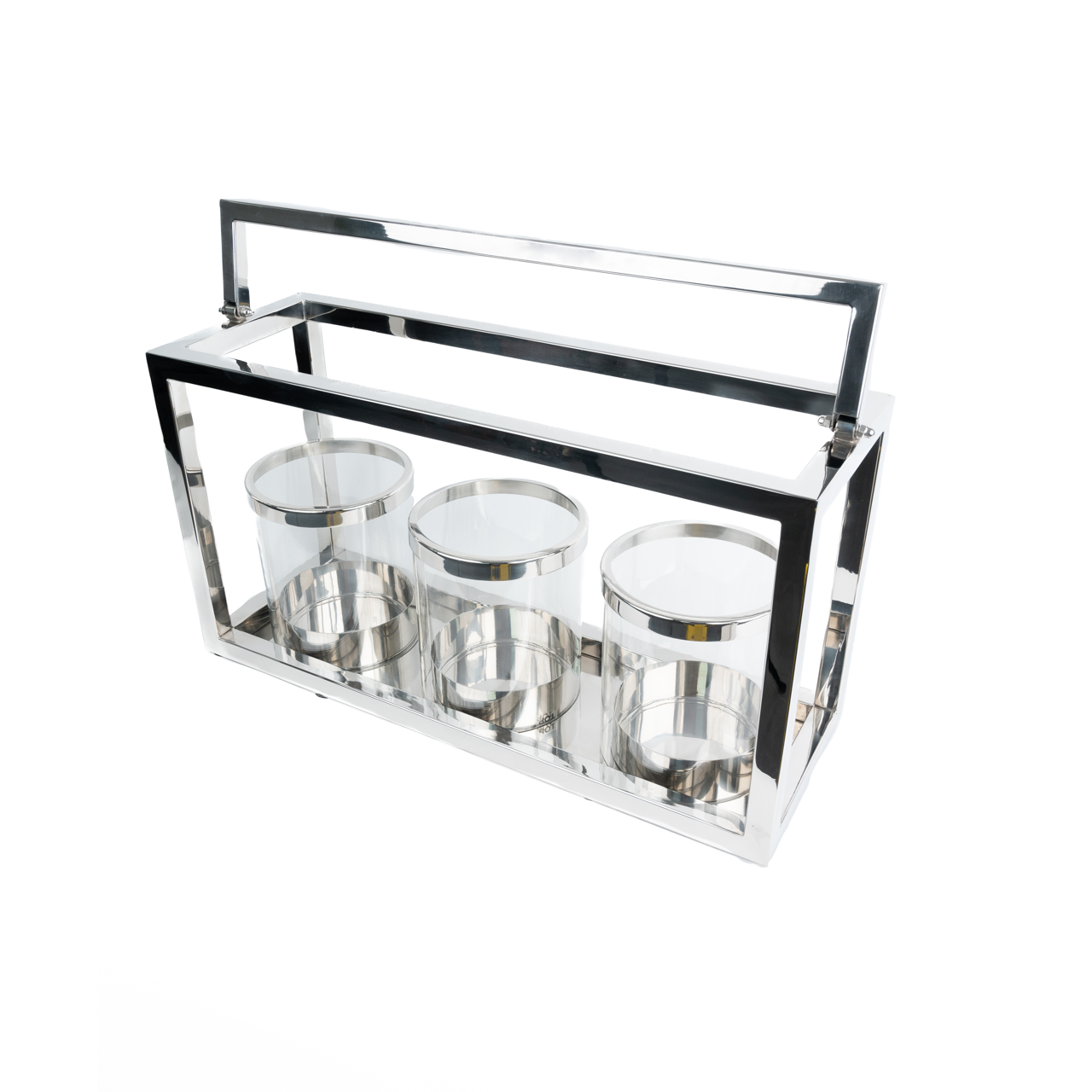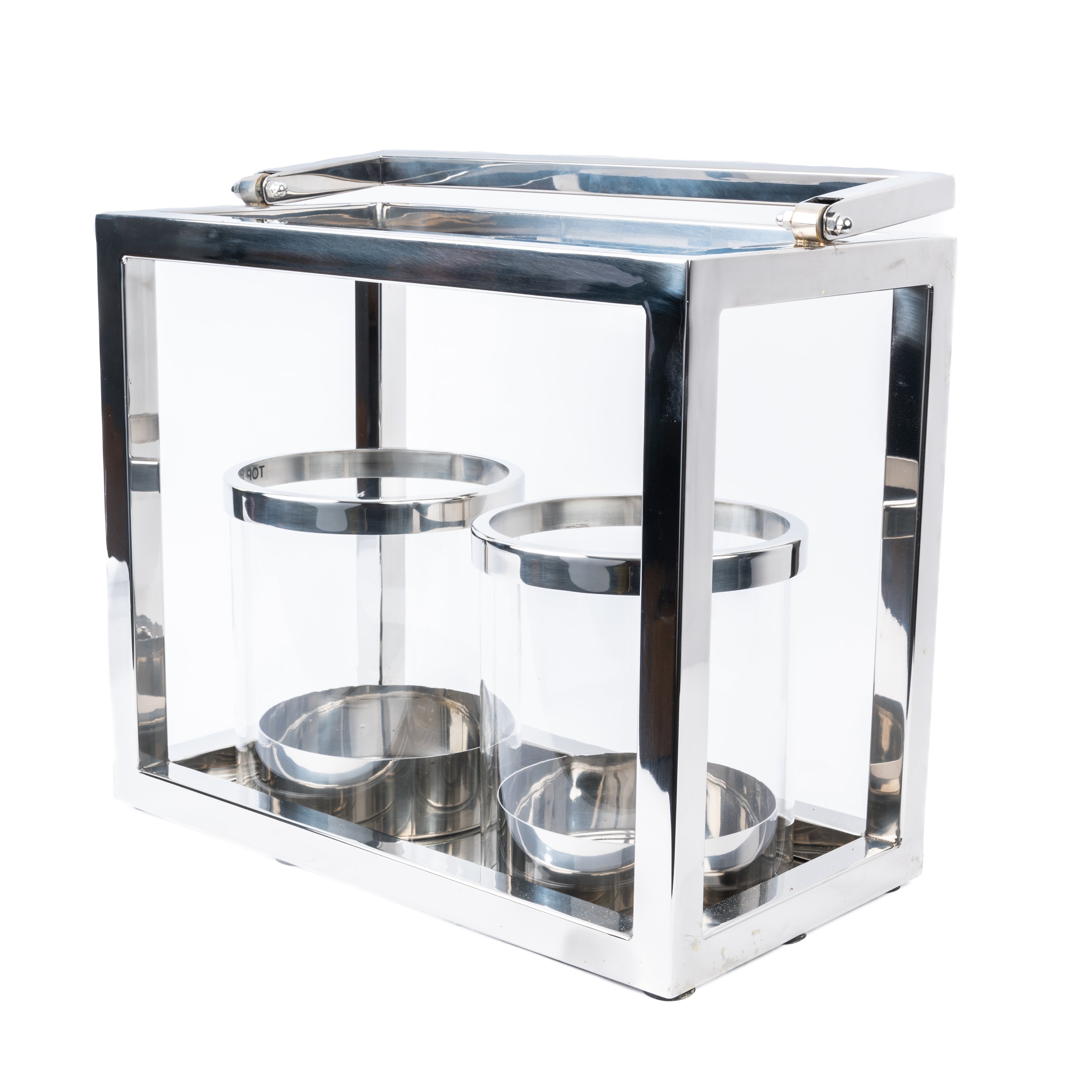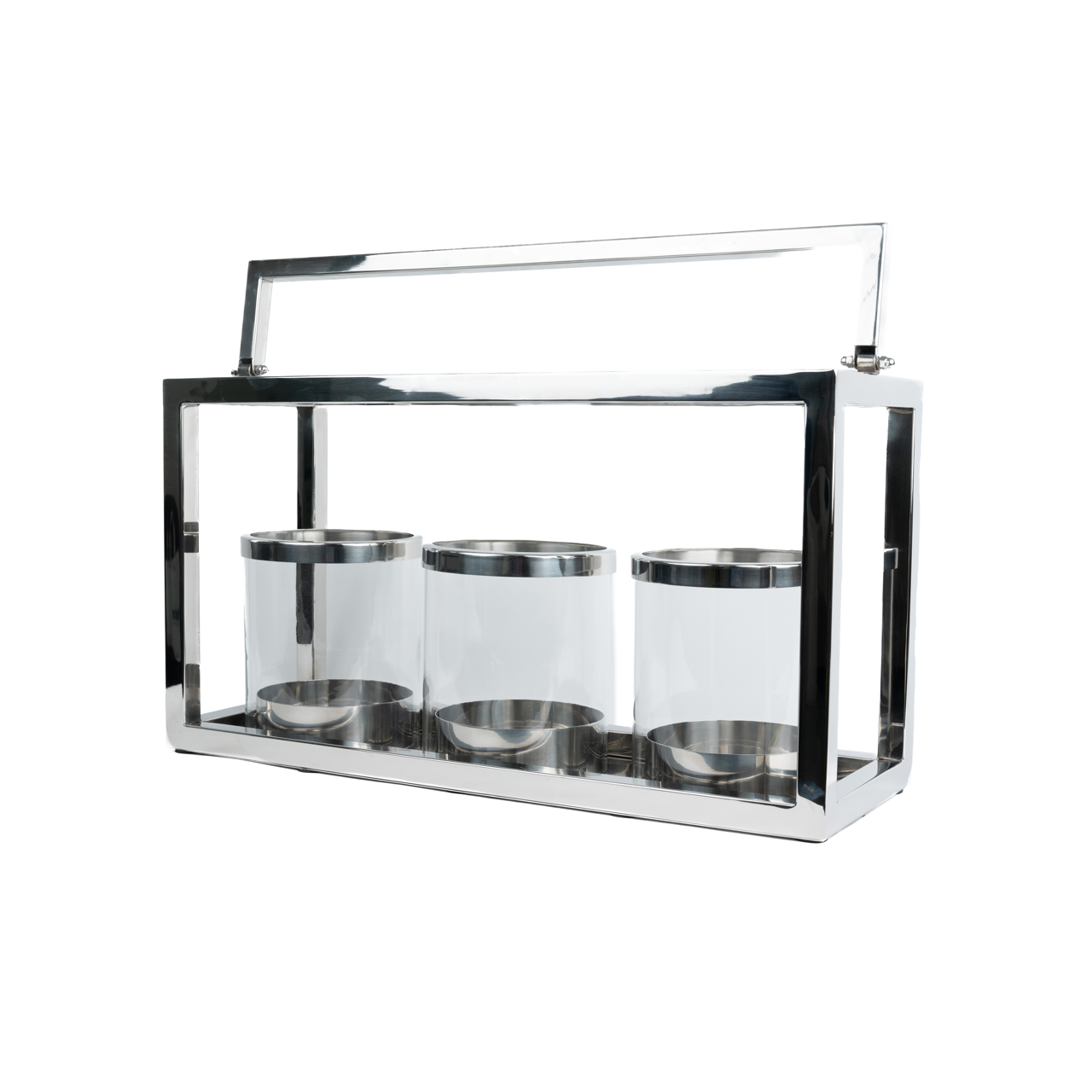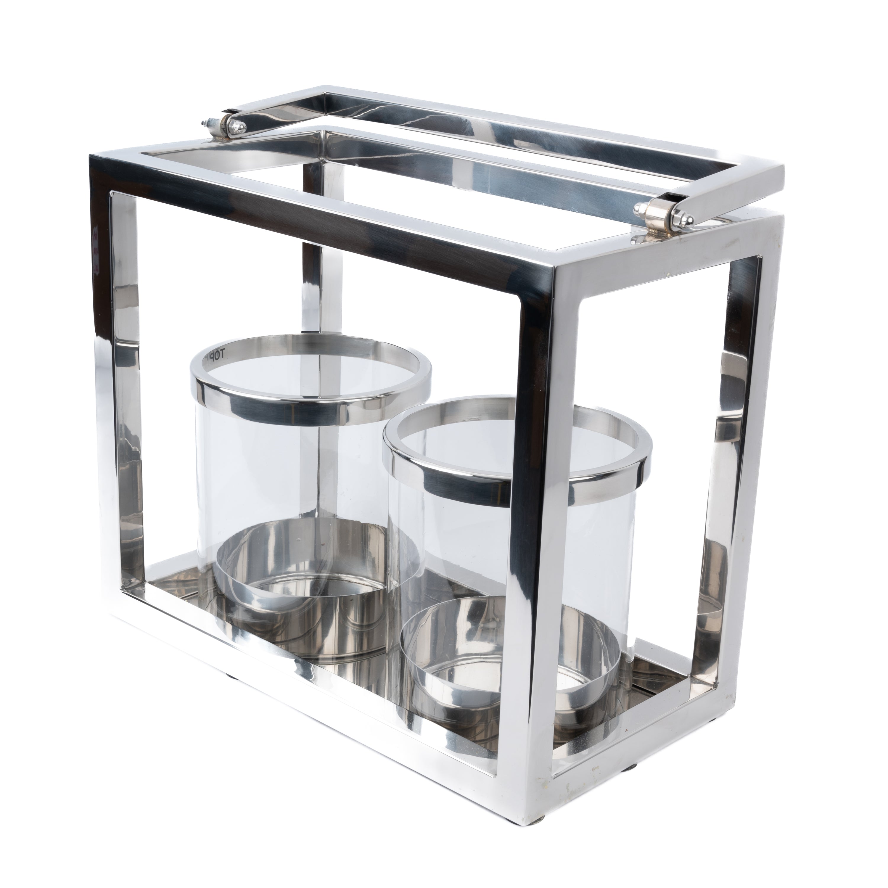 فانوس مميز بتصميم أنيق. تصميم زجاجي داخل حامل فولاذي مستطيل. مع مقبض للنقل، يمكن استخدامه في الخارج أو الداخل، كطاولة أو على الرف. متوفر بثلاثة أحجام: صغير، متوسط وكبير.