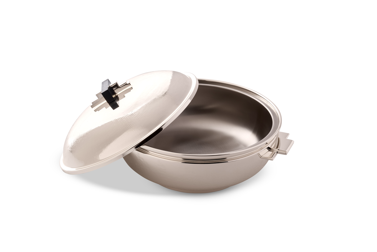 حافظة ArtDeco مصنوعة من طبق مزدوج، مصنوع من نحاس من الخارج وفولاذ مقاوم للصدأ من الداخل. يمكن الاعتماد على احترافية Zanetto في تصميمها وعزلها الحراري للحفاظ على درجة حرارة الطعام لفترة طويلة. مناسبة للأطعمة الباردة والساخنة، ولكن ليس للاستخدام في الفرن أو اللهب المباشر.