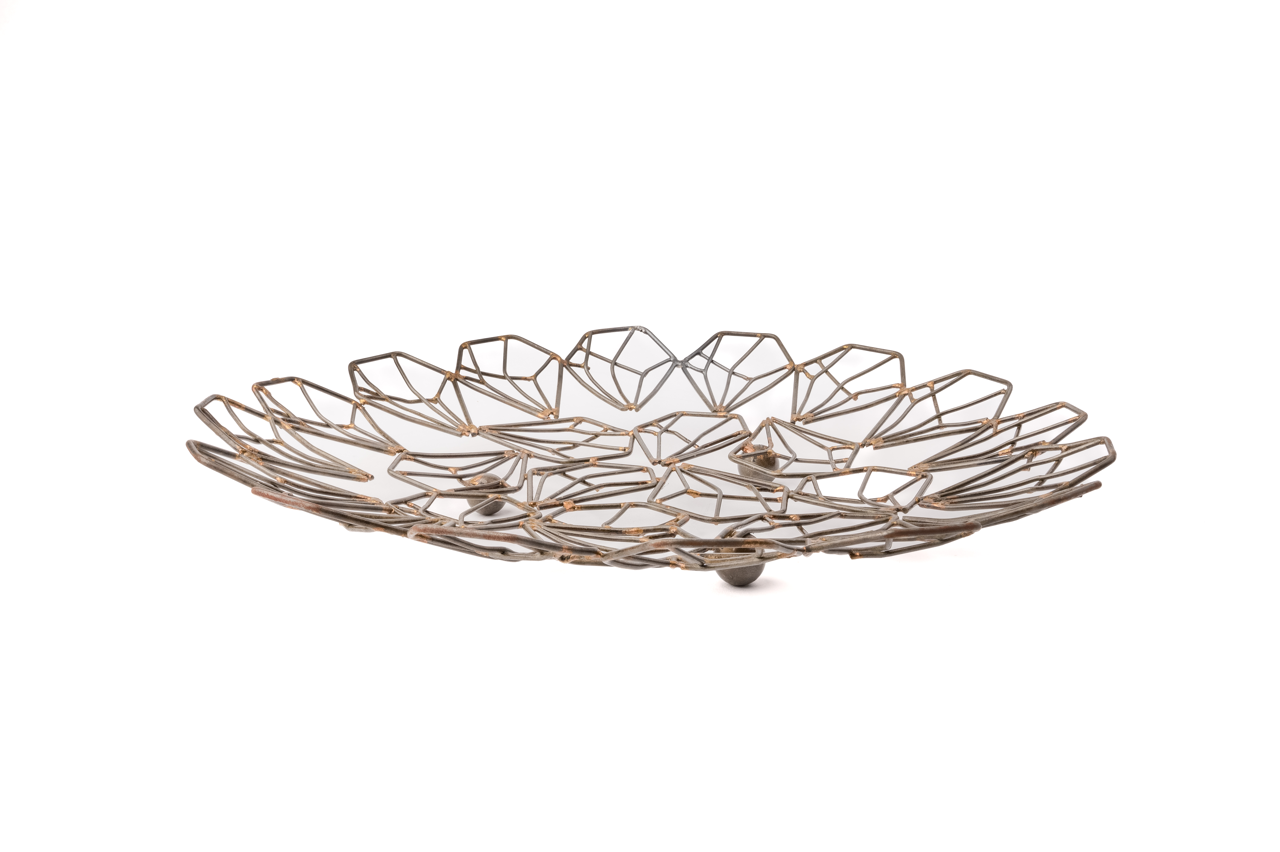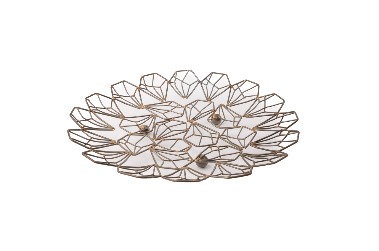لوحة معدنية تقديمية بسيطة وأنيقة، مُصنوعة يدويًا من أسلاك معدنية بتقنيات تقليدية. تُمكّنك من تقديم الفواكه أو وضعها للديكور. خفيفة الوزن وتوفّر مساحة للديكور.