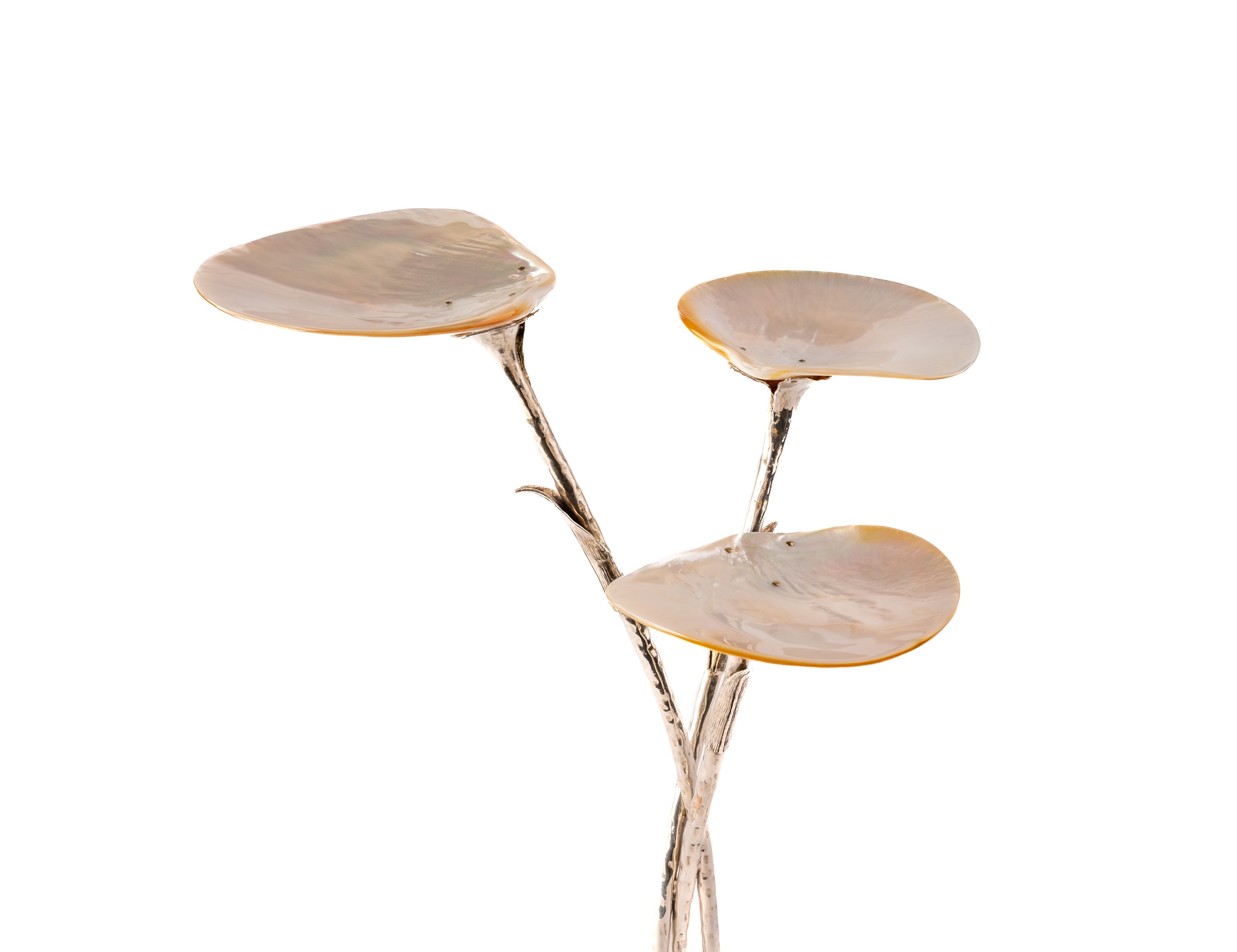In the prairie, surrounded by verdant green, flowers bloom, its face adoring the sun. Through rain and sunshine, it sits still, allowing the wind to sway its nimble stalk and its blades of leaves. Mastercraftsman Arden brings to life the delicate nature of the blossoms using the unassuming mop shells.