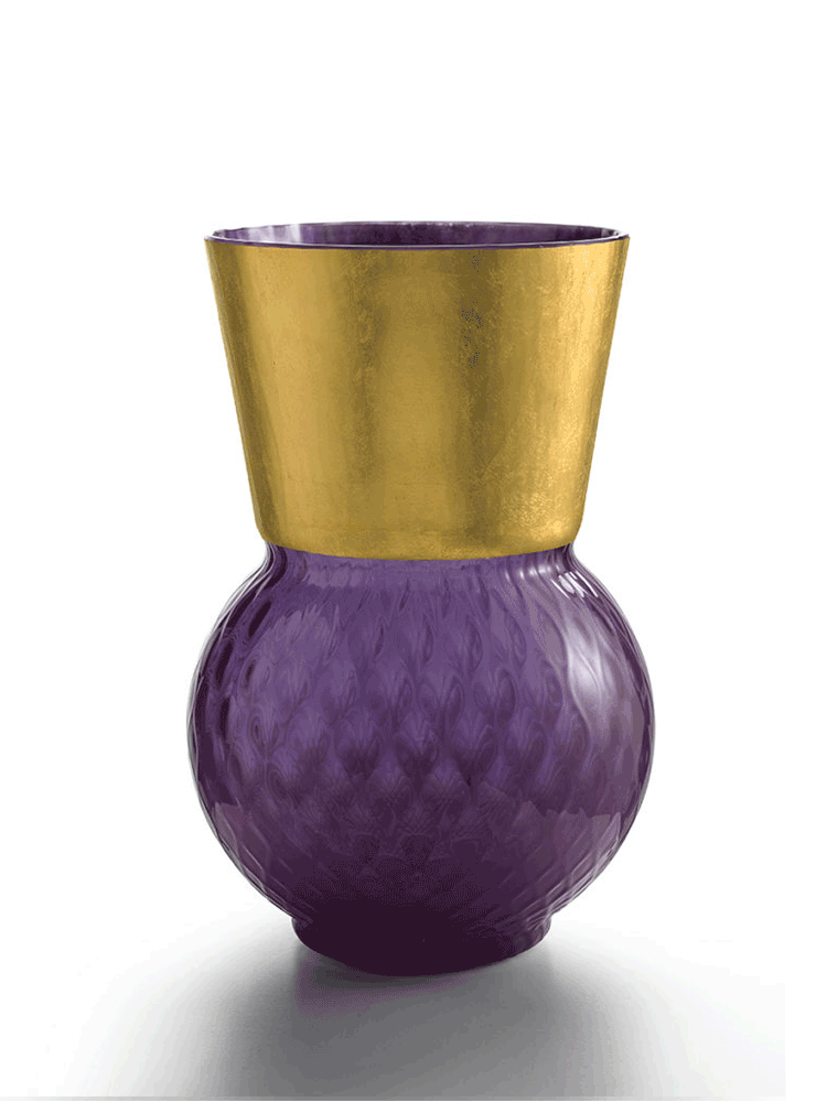 The Basilio collection, created and produced by Nason Moretti, leading Italian brand in the production of glasses, vases and design objects handmade in Murano glass, is characterized by the gold leaf that decorates the upper part of the vases, available in different colors. The medium vase Basilio is a unique piece of furniture, thanks to the balloon texture that spreads reflections and plays of light differently depending on the chosen shade.