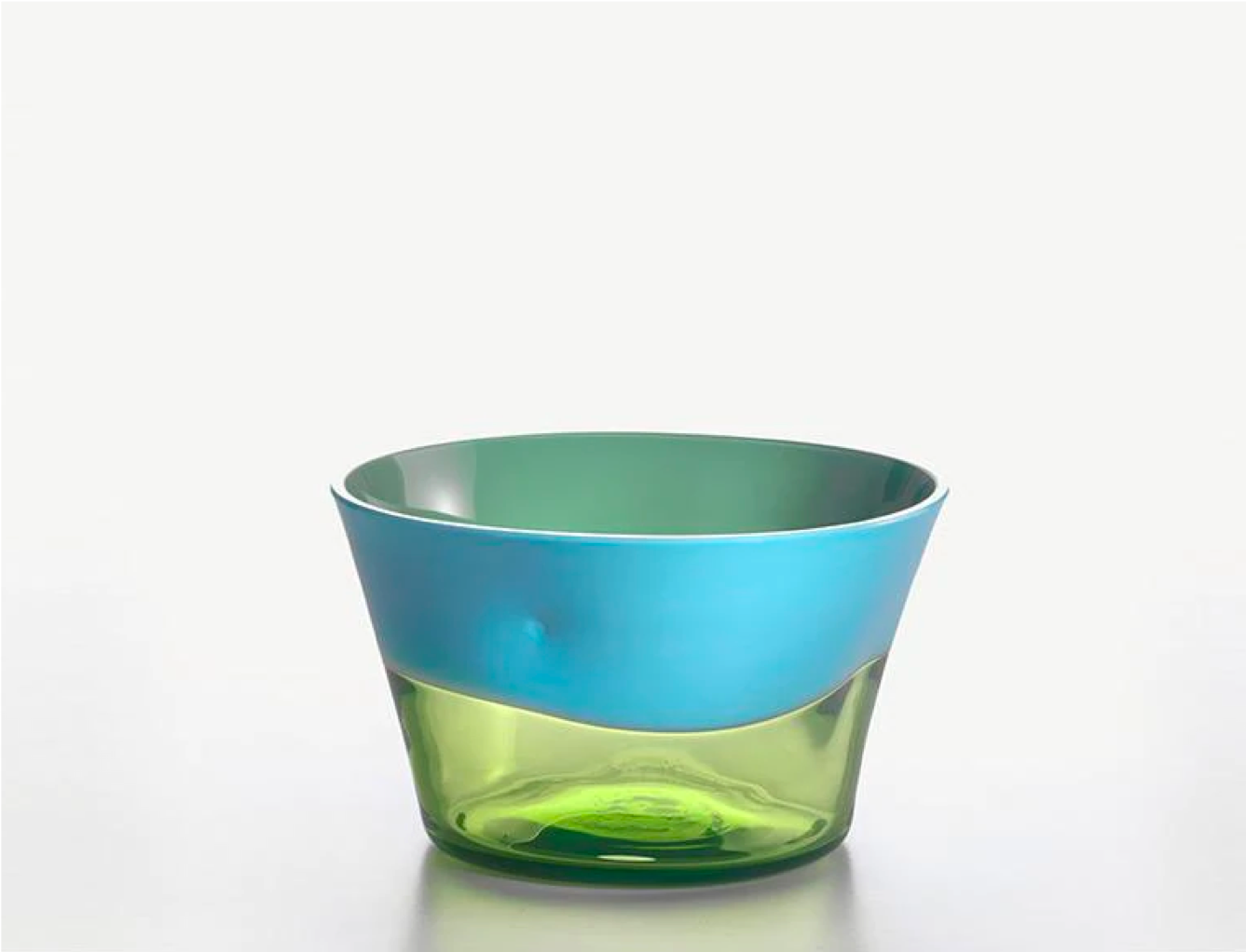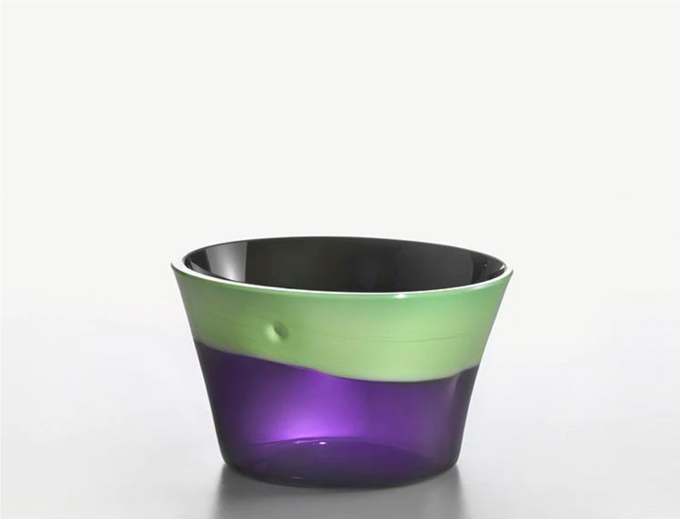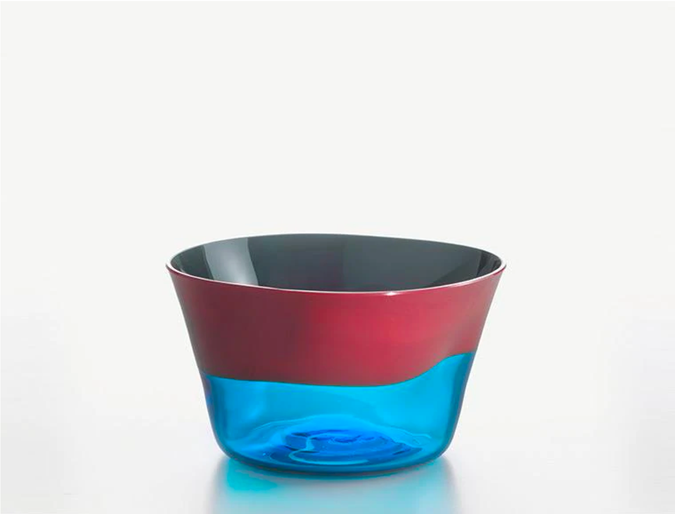 Part of the Dandy Collection, this glamorous glass bowl of Murano glass showcases a color silhouette enlivened by an external band painted in opaque secondary color. Its subtly uneven texture is obtained through a meticulous technique developed in 1951 that involves the squashing of the glass against the glassmith's hands to create an ergonomic, unrepeatable texture.