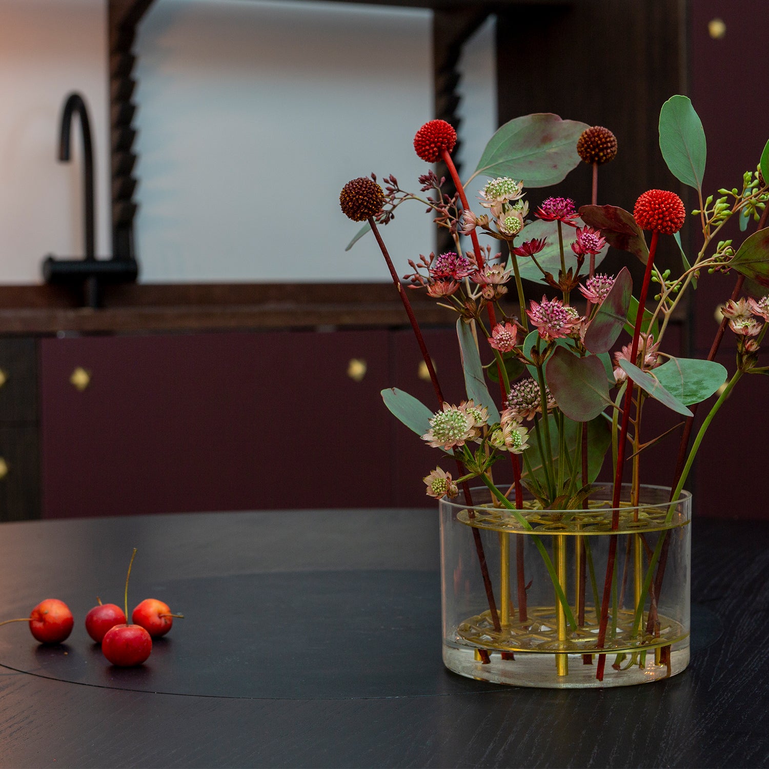 The Äng Vase is designed to let each flower stand beautifully on its own. Featuring a decorative brass insert with an intricate pattern, it transforms any floral arrangement into an elegant, sculptural display. The insert gently supports each stem, allowing for a harmonious and organized composition. Crafted from mouth-blown clear glass in Böhmen, Czech Republic, and paired with a brass insert, this vase is both a functional vessel and a work of art.