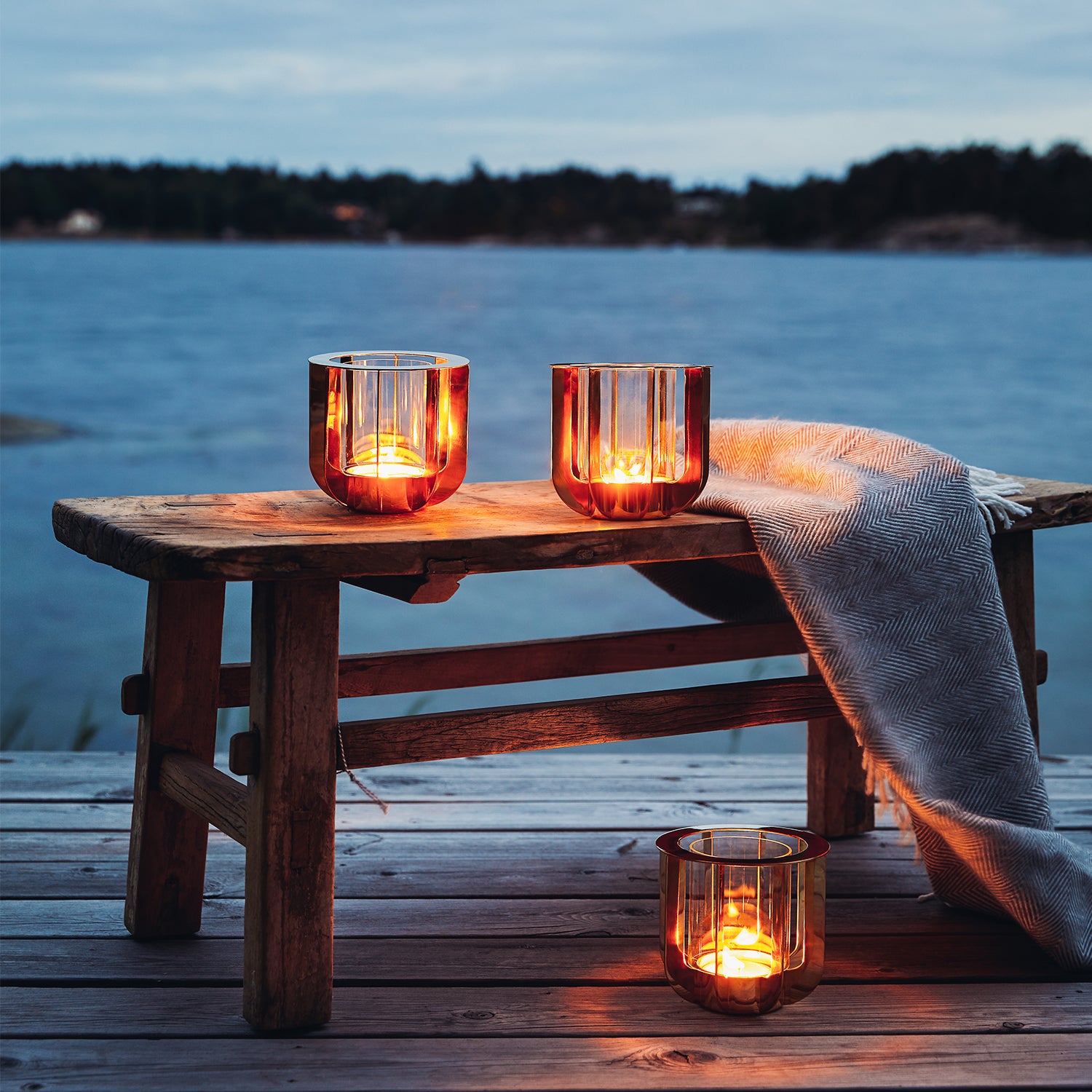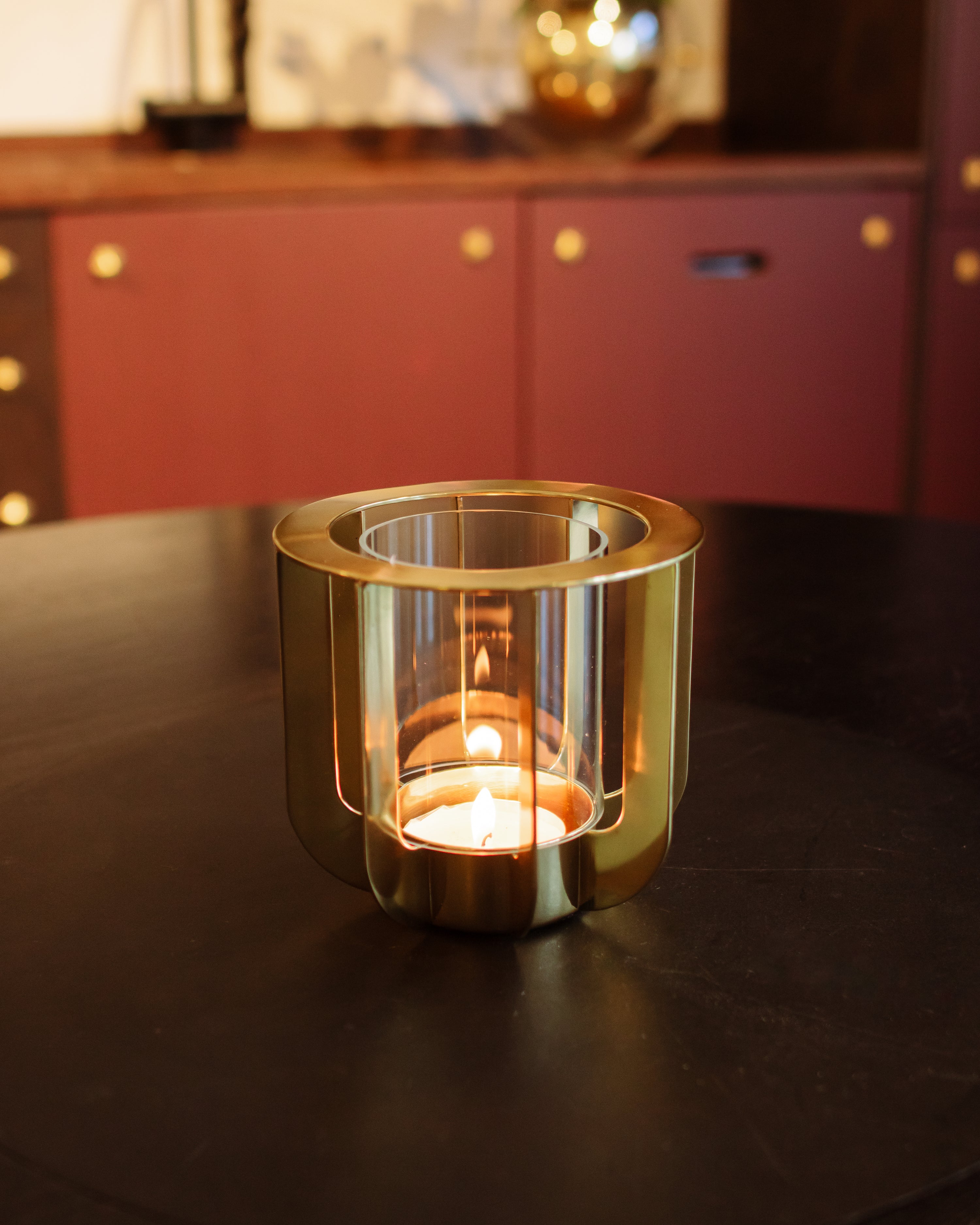Crafted from lacquered brass with a glass insert, the Jazz candle holder is designed for large tealights. When lit, it casts enchanting shadows through its vertical bars, creating a warm and atmospheric glow. Its polished finish requires no upkeep, making it both elegant and effortless.